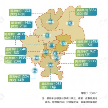 从区域来看,三季度贵阳土拍市场11个区域有成交,其中息烽县成交42宗,数量最多,其次是修文县成交23宗位居第二。从成交楼面价来看,三季度云岩虽然只成交了5宗,但其楼面价7621元/㎡位居首位,其次是观山湖区5640元/㎡的楼面价位居第二。其中,云岩新城地块楼面地价最高,同时以40.43亿元的成交总价成为三季度总价王;息烽旅投地块溢价5.34%排在溢价率TOP10榜首。