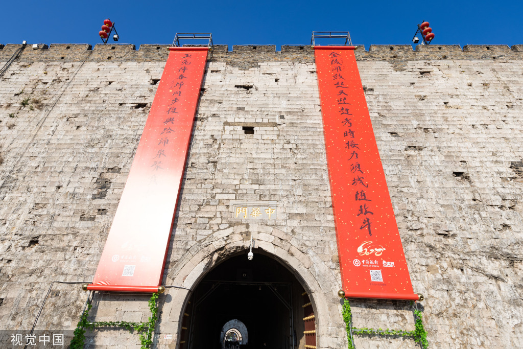 2023年1月10日,南京市,春节临近,明城墙中华门、玄武门等13座城门陆续挂上巨幅春联,营造出浓浓的节日氛围。图为中华门悬挂巨幅春联。
