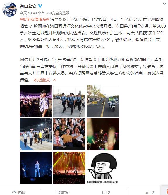 法网恢恢、学友不漏。11月3日、4日,“ 学友·经典 世界巡回演唱会”连续两晚在海口五源河文化体育中心火爆开唱。海口警方组织安保力量6600余人次全力以赴开展现场及周边治安、交通秩序维护工作,两天共抓获“黄牛”20人,贩卖假证件人员4人,抓获盗窃违法嫌疑人7名,缴获假证、假演唱会门票、假CD等物品一批,服务、救助观众160余人次。