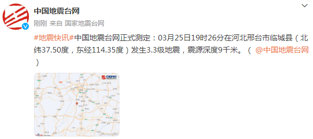 中国地震台网正式测定:03月25日19时26分在河北邢台市临城县(北纬37.50度,东经114.35度)发生3.3级地震,震源深度9千米。