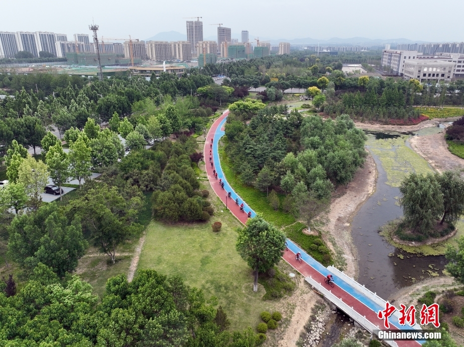 5月25日,骑行者在山东省日照市莒县沭东苗木基地绿道骑行锻炼。该绿道全长8.21千米,配套设施完善,设置驿站、绿道标识等,极大方便骑行、健步、慢跑等健康活动的开展。(无人机照片)中新社记者 毛建军 摄