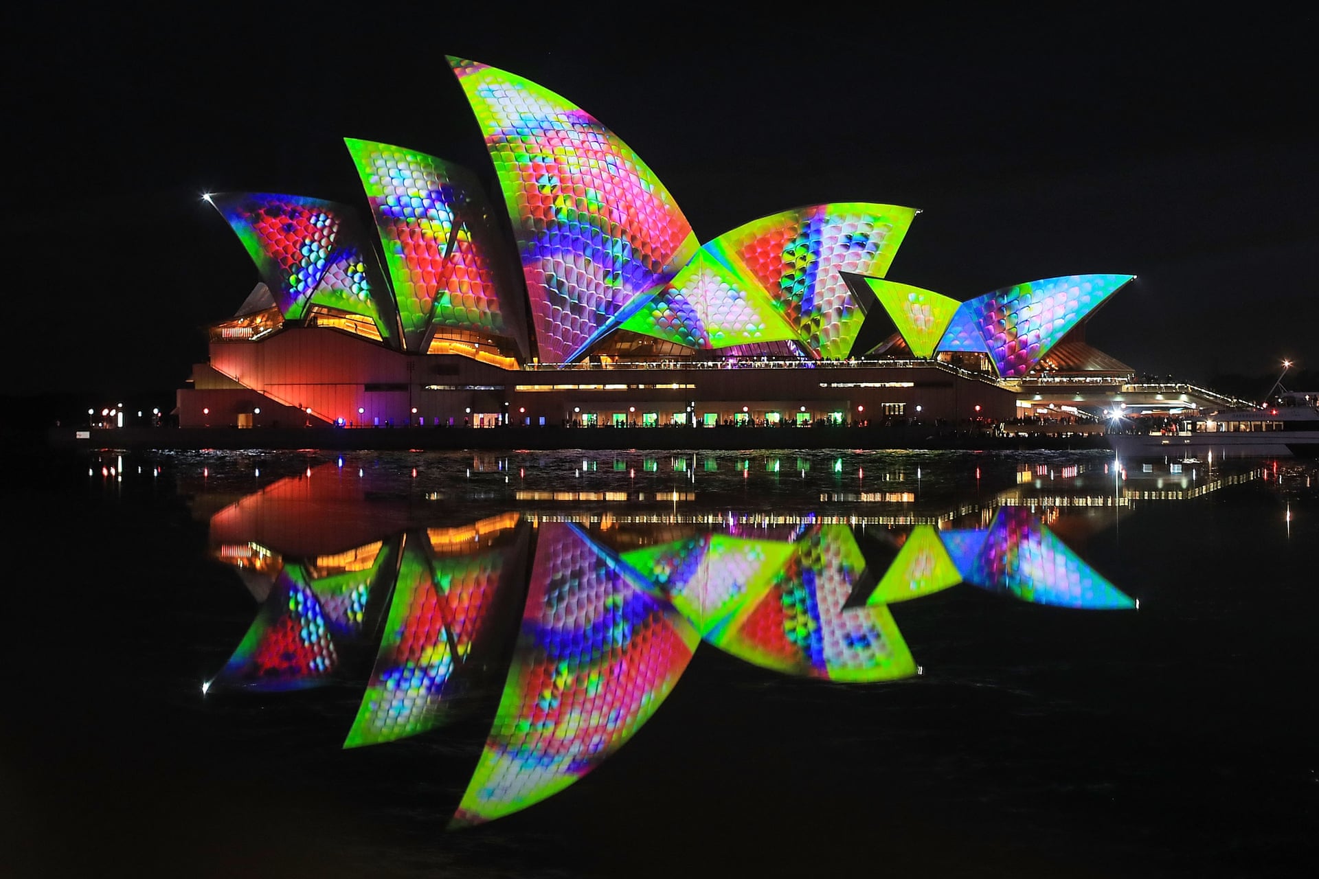 悉尼歌剧院也参加了今年的“缤纷悉尼灯光节”(Vivid Sydney Festival),这项在冬季举行的活动会在悉尼城各处设置光影雕塑和灯光装置。