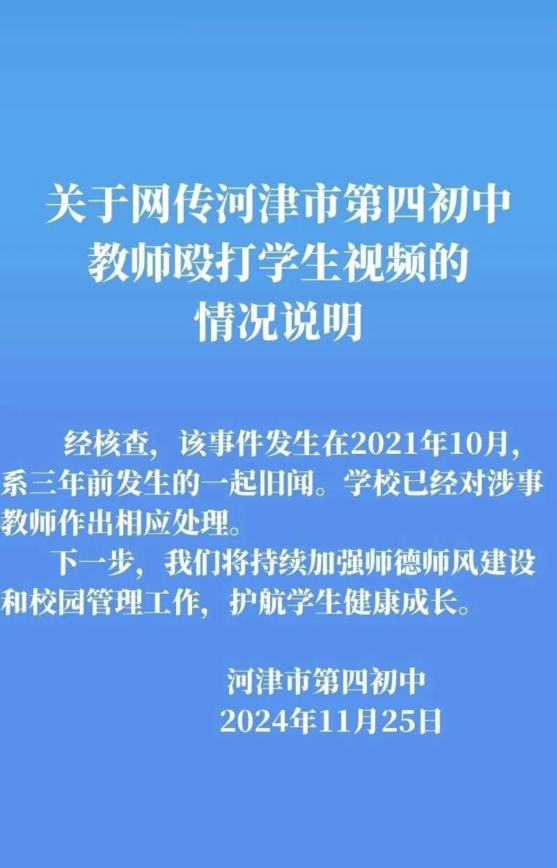 网传山西河津第四初中教师殴打学生,学校回应:系三年前旧闻,已经对涉事教师作出相应处理