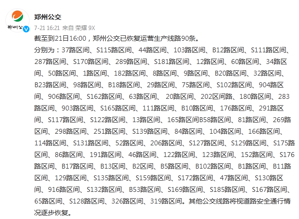 郑州公交:截至到21日16:00,郑州公交已恢复运营生产线路90条