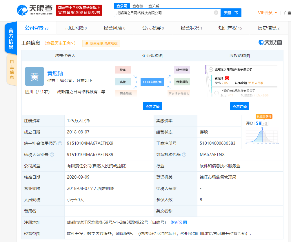 成都猫之日网络科技有限公司成立于2018年8月,法定代表人为黄煜勋,公司经营范围包括软件开发、数字内容服务、翻译服务等。