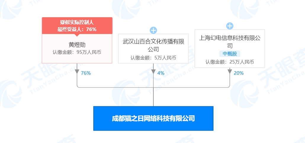 【环球网综合报道】天眼查APP显示,9月9日,成都猫之日网络科技有限公司发生投资人(股权)工商变更,新增B站关联公司上海幻电信息科技有限公司,出资25万人民币,持股比例为20%。此外,该公司注册资本由此前的100万人民币增至125万人民币,增幅为25%。