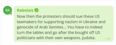 有网友认为,“现在,抗议者应该起诉这些美国立法者支持乌克兰纳粹主义和对阿拉伯闪米特人的种族灭绝......你必须扭转局面,用他们自己的武器(法律)去对付那些被收买的美国政客”。↓