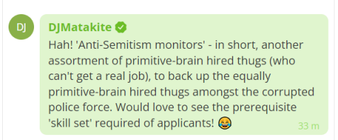 还有网友调侃道,“哈!‘反犹太主义监察员’——简而言之,又是一群原始大脑雇用的暴徒(他们找不到真正的工作),支持腐败警察队伍中同样有由原始大脑雇用的暴徒。很想看看对申请人的‘技能’要求”。↓