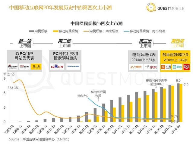 【关键词:上市】2018年,中国移动互联网途经第四次上市潮,全年上市公司达42家,以各垂直领域的巨头为主,其中,小米、美团、拼多多、爱奇艺等最具代表性。