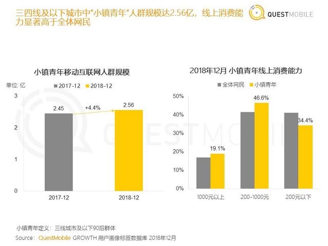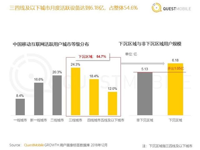 【关键词:下沉】三四线及以下城市月度活跃设备达到6.18亿,占整体的54.6%;MAU同比增量最大的10款应用中的9款,来自三四线及以下城市的增量均大于一二线城市增量。快手、拼多多、趣头条在城市下沉中获取新的流量,可称为“下沉三巨头”。