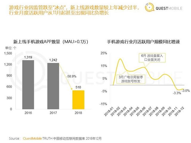 【关键词:监管】2018监管风暴席卷多个行业,违规APP重则永久关停,轻则下架整改,行业全面迎来规范化;游戏行业因此跌至“冰点”,新游上线数量较上年减少近半,行业月度活跃用户从11月起甚至出现同比负增长。