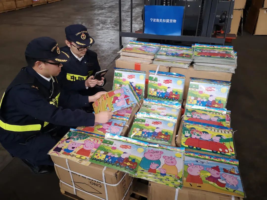2019年1月宁波海关在货运渠道查获一批印有“Peppa Pig, George Pig, Daddy Pig, Mommy Pig”(简称“小猪佩奇”)标识的拼图,数量共有10箱3200张,按正品价值计算约10万元。经权利人娱乐壹英国有限公司确认,上述货物为侵权产品,宁波海关依法予以扣留。宁波海关开展“龙腾行动2019”,坚持“严保护”政策导向,严厉打击侵犯著作权案件。全年共查获侵犯著作权案件23起,查获侵权商品数量 59218件,按正品价值计算约400万元,涉及的著作权包括“小猪佩奇”“汽车总动员”“小黄人”等。