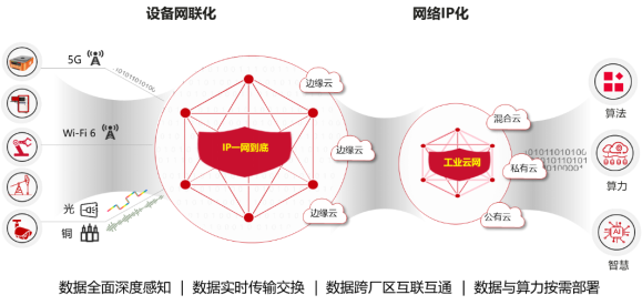 更重要的是“网络IP化”,让设备和系统都说“普通话”,用统一的互联网协议(IP协议)提升异构工业网络的互通能力,打通数据孤岛,做到数据的实时传输和交换,让算力惠及每一个角落,使每台设备都智能起来。