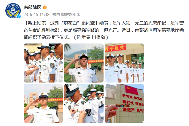 勋表,是军人独一无二的光荣印记,是军营奋斗者的胜利标识,更是照亮强军路的一道光芒。近日,南部战区海军某基地岸勤部组织了勋表授予仪式。(陈堂贵 肖望渤)