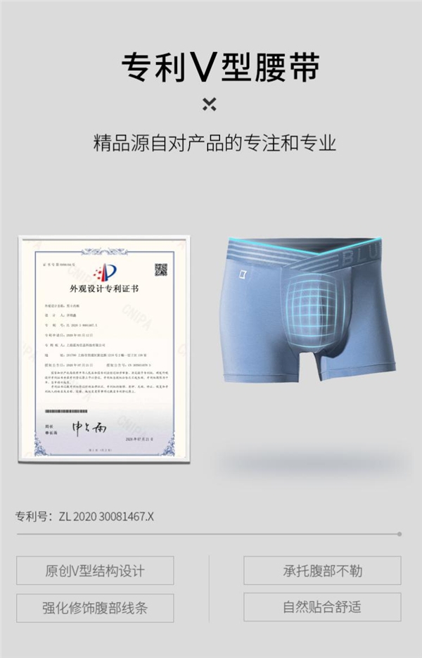 例如:肚子圆润的男士穿内裤时容易勒肚子,蓝内“明星大V裤”系列产品采用V领的创新设计,不但解决了内裤勒肚子的烦恼,而且还有一定的托举功能,大幅提高舒适度;大腿粗壮的男士容易勒腿卡臀缝,蓝内“开叉裤”系列产品通过A型裤腿裁剪和臀线结构的增加,让裤型更贴合体型,不容易起褶皱,兼顾商务与日常运动场景。