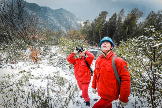 国网浙江温州供电公司员工巡视霜冻易发山区线路。