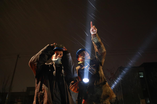 国网吉林电力员工顶风冒雪开展城市输电线路巡查。