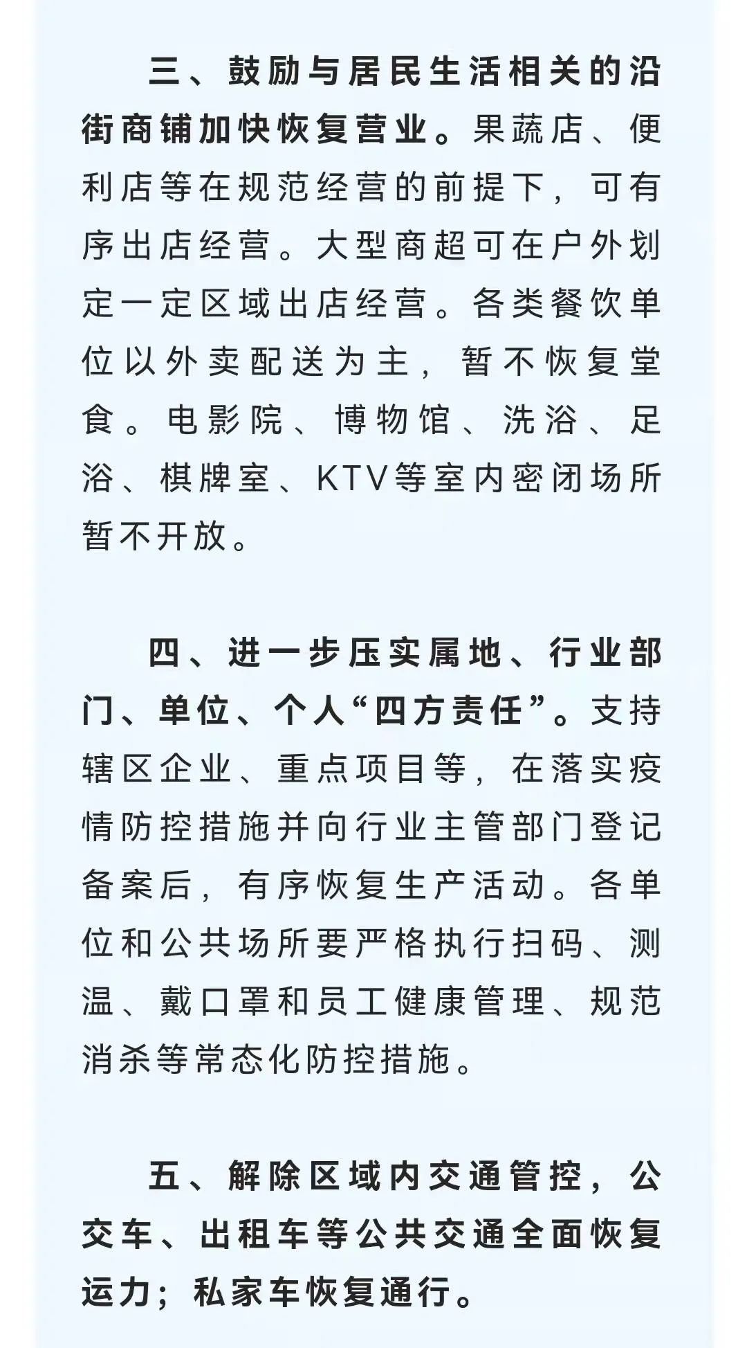 三、鼓励经营场所恢复营业。 鼓励超市、便利店、生鲜店、蔬果店、药店、农贸市场、商贸企业以及孕婴店、理发店、干洗店、烘焙店、快递网点、五金农资销售、银行网点等与居民生活相关的经营场所加快恢复营业,实行“承诺制”,严格落实疫情防控各项措施。各类餐饮单位以外卖配送方式为主,不堂食、不聚集。洗浴店、棋牌室、KTV、网吧、影院等室内场所暂不开放。