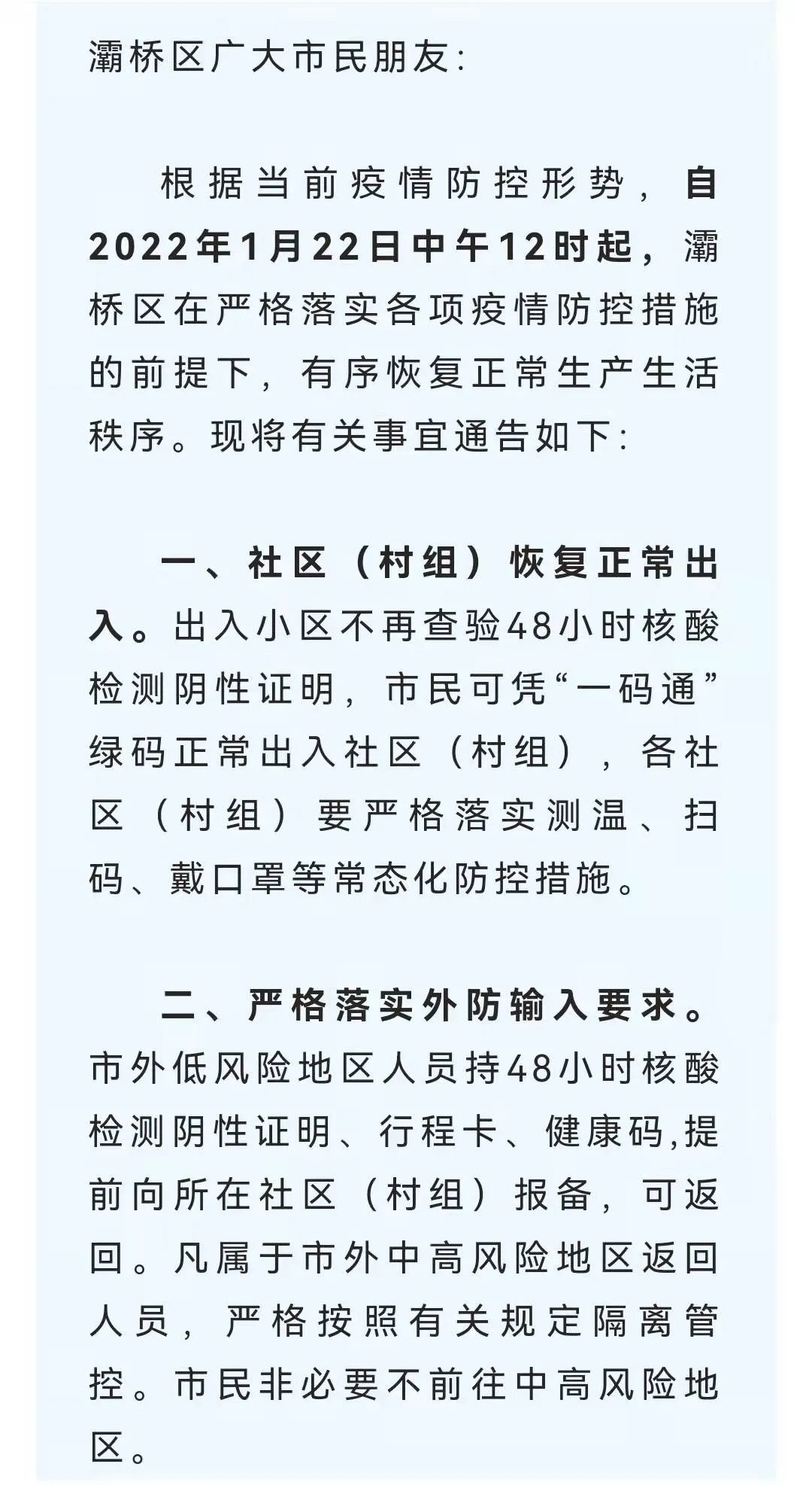 一、恢复辖区正常出行。 辖区居民(村民)凭“一码通”绿码出入社区(村组),不再查验48小时核酸阴性证明。严格落实测温、扫码、戴口罩等防控措施,坚决做到不扎堆、不聚集,保持勤洗手、常通风、一米线、公筷公勺等健康生活方式。非必要不离开秦汉新城,不前往中高风险地区。如出现发热、咳嗽等症状,第一时间向所在社区(村组)报告,到秦汉新城第三医院或西咸新区中心医院发热门诊诊治。