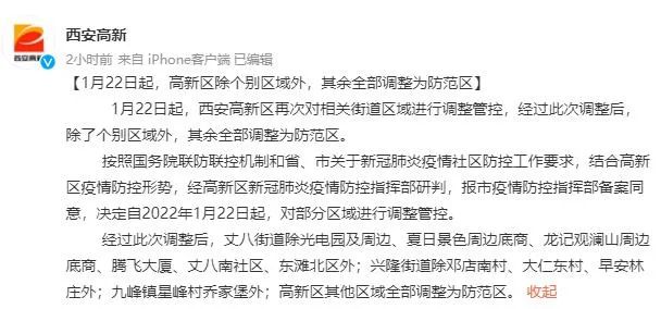 1月22日起,西安高新区再次对相关街道区域进行调整管控,经过此次调整后,除了个别区域外,其余全部调整为防范区。