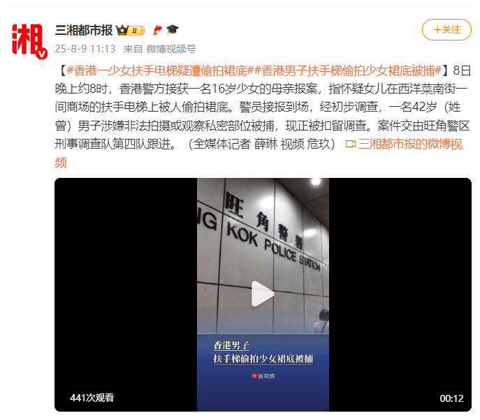 香港一男子在扶手电梯上偷拍少女裙底,已被扣留调查