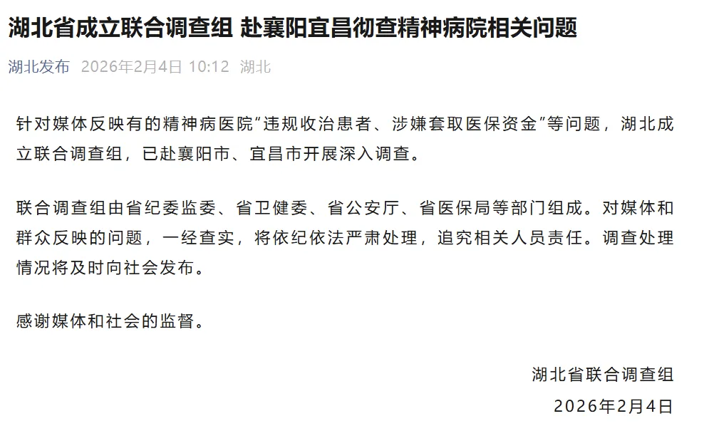 针对媒体反映有的精神病医院“违规收治患者、涉嫌套取医保资金”等问题,湖北省成立联合调查组,已赴襄阳市、宜昌市开展深入调查,表示一经查实,将依纪依法严肃处理,追究相关人员责任。