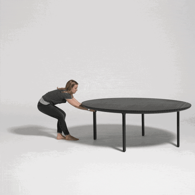 当你拉动桌脚,桌面随着桌脚的移动越来越长,瞬间从一张原本直径只有1.8米的圆桌变成了一张4米长的椭圆形桌。
