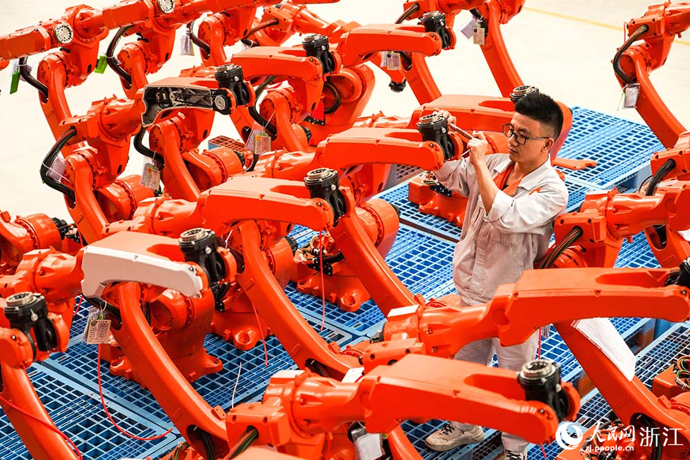 人民网台州4月17日电 (孙鹏)近日,在浙江钱江机器人有限公司生产车间里,工人正在进行机器人组装作业,赶制订单供市场。今年一季度,该公司机器人订单同比增长70%左右,呈现出强劲的发展态势。作为浙江省领先的工业机器人本体企业,近年来,钱江机器人围绕科技创新和产业创新,聚焦“未来工厂+产业大脑”核心架构,持续深化“新智造计划”,全力推动产业链数字化升级。工人在车间里进行机器人组装作业,赶制订单供市场。人民网 章勇涛摄