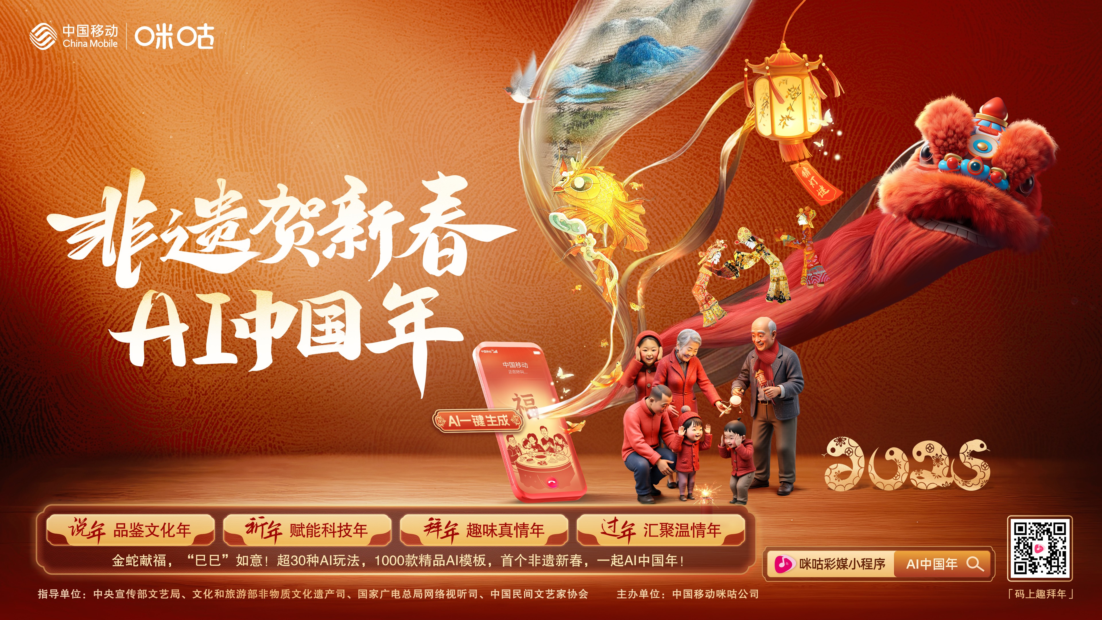 作为国资央企最大的文化科技公司、最大的互联网平台、最大的新媒体平台,中国移动咪咕以AI新质生产力架起非遗新春与大众之间的桥梁,用AI视频彩铃让非遗文化“活”起来、“新”起来,让人人都能成为AI中国年的创作者、传播者,与全球华人共创、共享非遗春节的喜悦,助力非物质文化遗产保护和传承。
