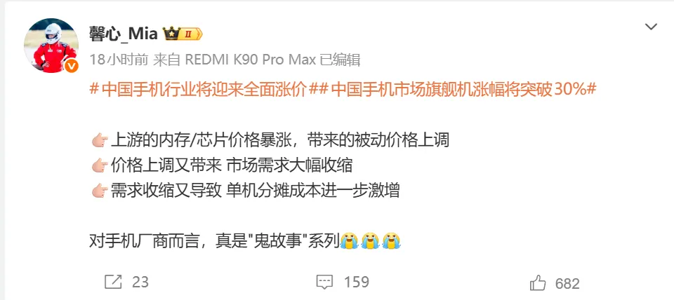 不过有数码博主表示,手机涨价的原罪并非存储,而是全供应链材料集体涨价带来的结果。