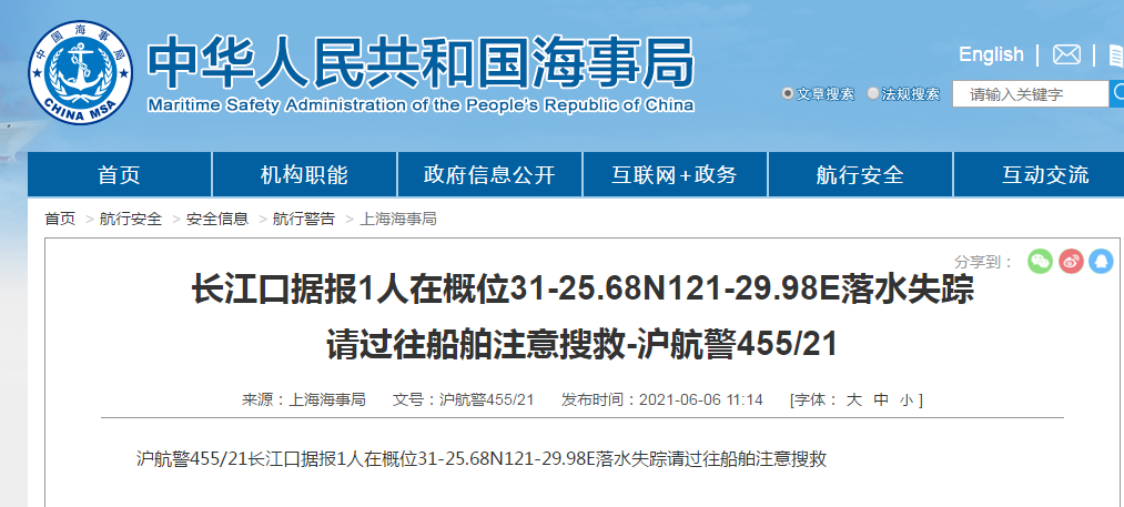 上海海事局:据报长江口有一人落水失踪,请过往船舶注意搜救