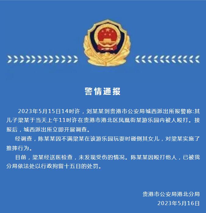 广西贵港警方回应“男童在游乐园内被人殴打”:打人者被拘十五日