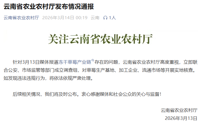 云南省农业农村厅通报:成立调查组核查冻干草莓产业链,如发现违法违规行为将依法依规严肃处理