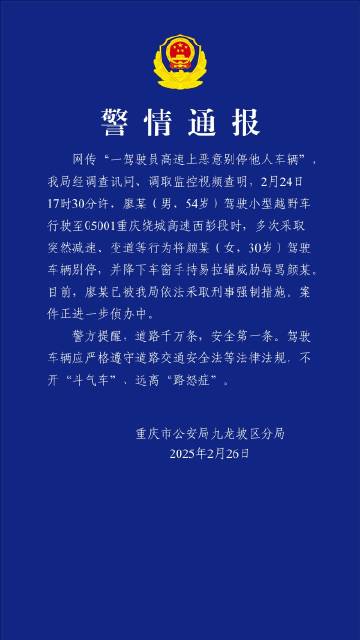 重庆九龙坡警方通报“驾驶员高速上恶意别停他车”:已采取刑事强制措施