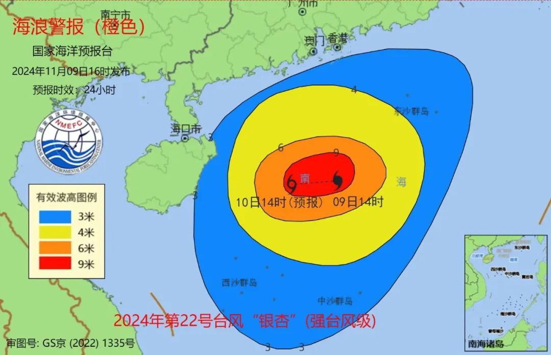 受今年第22号台风“银杏”和冷空气的共同影响,预计11月9日夜间到10日白天,南海北部、中部将出现6到10米的狂浪到狂涛区,近海海域海浪预警级别为橙色;海南东部近岸海域出现2.5到3.5米的大浪,该近岸海域海浪预警级别为黄色,广东西部、中部近岸海域将出现2到3米的中浪到大浪,该近岸海域海浪预警级别为蓝色。请在上述海域作业的船只注意安全,沿海各有关单位提前采取防浪避浪措施。