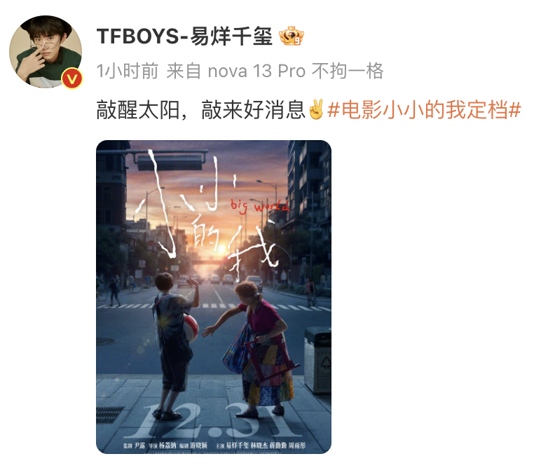 随后,电影主演易烊千玺、林晓杰等人先后发文祝贺。