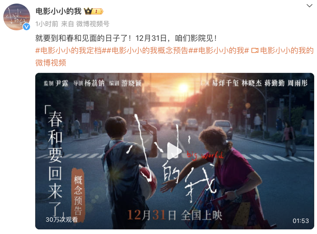 12月9日,电影《小小的我》官方账号宣布定档12月31日,并发布概念预告和电影海报。