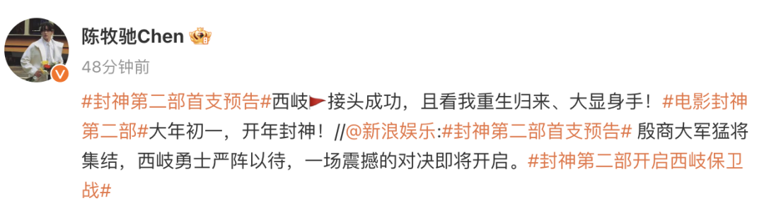 预告片发布后,殷郊的扮演者陈牧驰也在个人社交账号转发称,“接头成功,且看我重生归来、大显身手!”