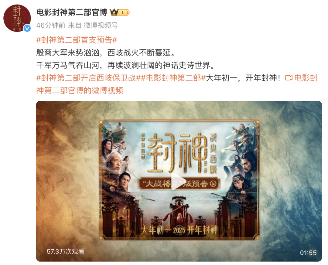 12月18日,@电影封神第二部官博 发布《封神第二部》首支预告片,并表示电影将于大年初一上映。