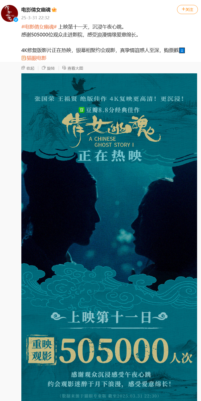 据影片官博消息,3月31日,《倩女幽魂》上映第11天,观影人数超50万。“感谢505000位观众走进影院,感受浪漫情缘爱意绵长。”