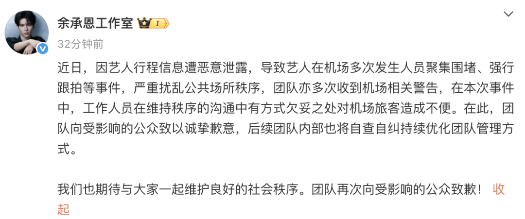 7日中午,@余承恩工作室 发文致歉,称:近日,因艺人行程信息遭恶意泄露,导致艺人在机场多次发生人员聚集围堵、强行跟拍等事件,严重扰乱公共场所秩序,团队亦多次收到机场相关警告,在本次事件中,工作人员在维持秩序的沟通中有方式欠妥之处对机场旅客造成不便。 在此,团队向受影响的公众致以诚挚歉意,后续团队内部也将自查自纠持续优化团队管理方式。
