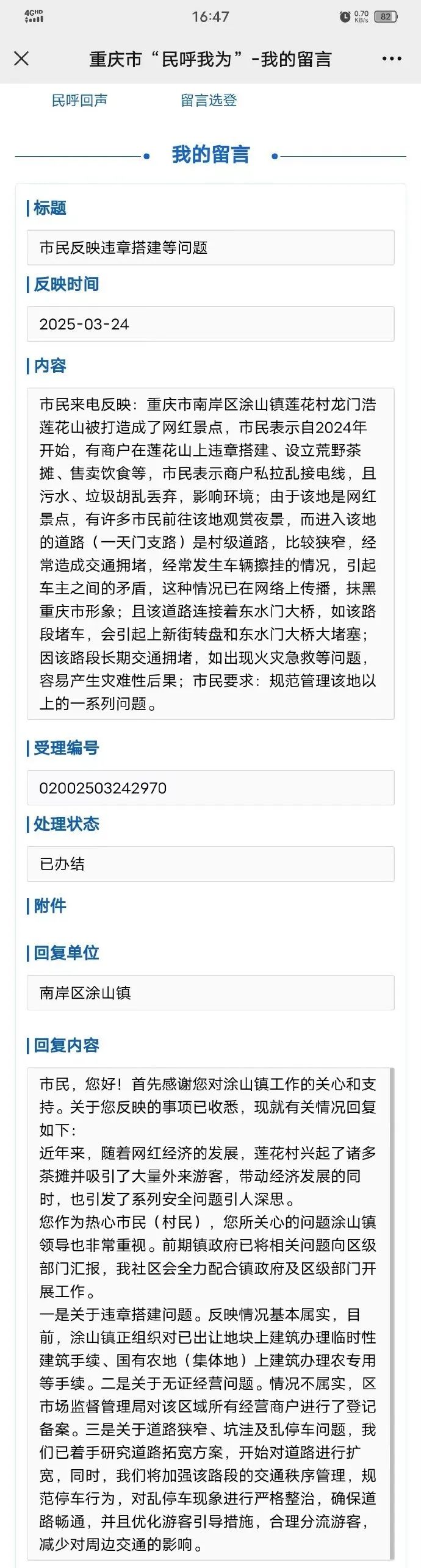 据百姓关注报道,市民贺先生表示,3月24日他通过12345热线反映过违章搭建问题。 贺先生提供的记录显示,涂山镇政府在“民呼我为”平台曾回应违章搭建事实属实。该回应显示,莲花山商户已登记备案,对道路狭窄问题已开始扩宽。莲花村委会工作人员回应称,当地正在协调解决已发现的安全隐患,并对莲花山网红打卡地进行整体升级改造。