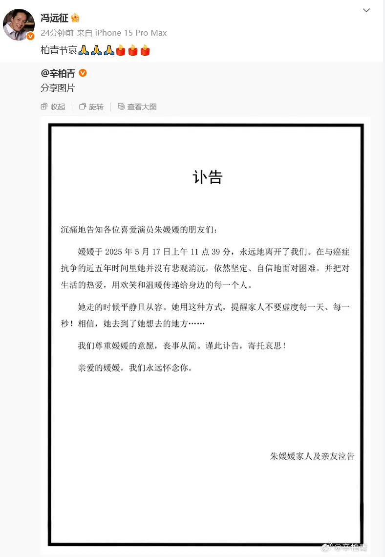 5月21日,辛柏青发布妻子朱媛媛去世讣告,“媛媛于2025年5月17日上午11点39分,永远地离开了我们。在与癌症抗争的近五年时间里她并没有悲观消沉,依然坚定、自信地面对困难。”