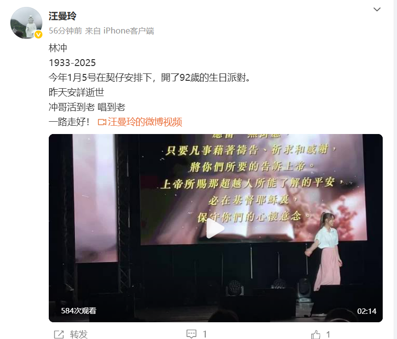 随后,资深媒体人汪曼玲发文悼念:“林冲,1933-2025,今年1月5号开了92岁的生日派对,昨天安详逝世。冲哥活到老,唱到老,一路走好!”