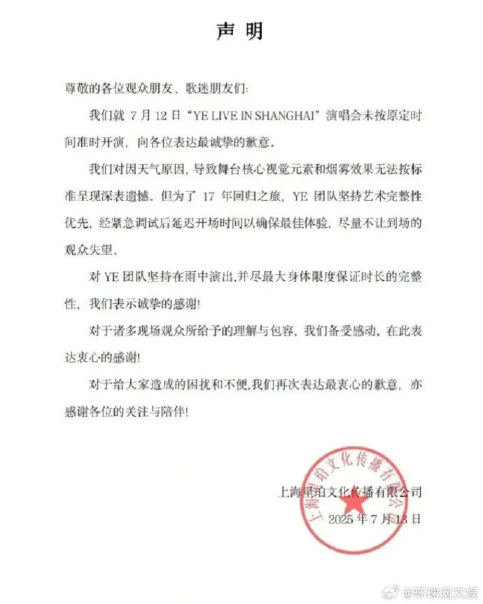 13日晚,主办方@上海星珀文化StellarAmberGroup 发布声明致歉,称就7月12日“YE LIVE IN SHANGHAI”演唱会未按原定时间准时开演,向各位表达最诚挚的歉意。