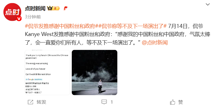 7月14日,据青岛广播电视台点时新闻,侃爷(Kanye West/YE)发推感谢中国粉丝:“感谢我的中国粉丝,气氛太棒了,会一直爱你们所有人,等不及下一场演出了。”