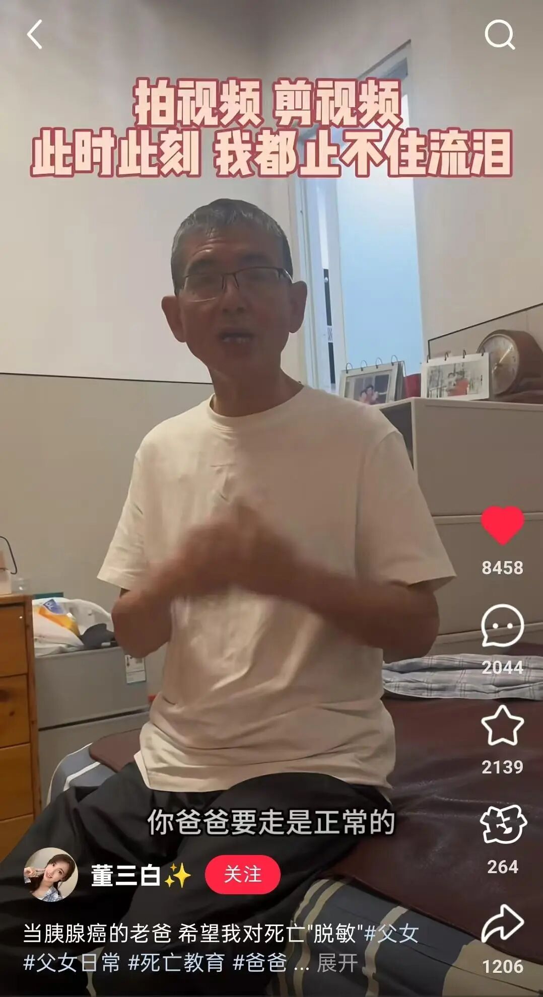 近日网络上广为流传的一则视频里,胰腺癌患者董先生穿着白色短袖,身形消瘦,对着女儿董三白(化名)的镜头,如此讲述着自己对死亡的看法。