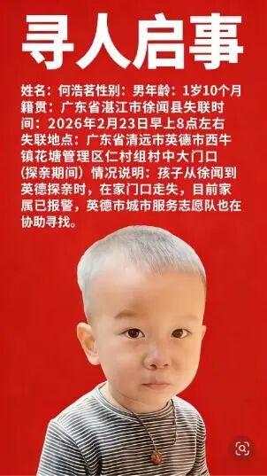 据寻人启事,失联男童姓名何浩茗,1岁10个月,广东省湛江市徐闻县人。其从徐闻到英德探亲时,2月23日早上8点左右,在西牛镇花塘村仁村组走失,目前家属已报警,英德市城市服务志愿队也在协助寻找。