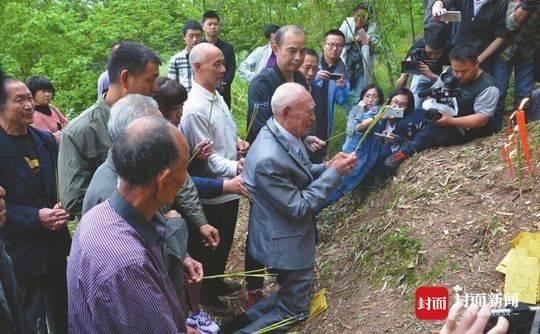 同年4月19日,成都双流国际机场,胡老所乘飞机稳稳降落在四川土地上,他蹒跚着从机舱走出,眼前的景象令这位老人眼眶湿润。第二天,离家已经70余载的胡定远,终于回到阔别已久的家乡——四川省泸州市合江县白米镇转龙湾村,跟他三个姐姐的80余位后人共聚一堂,更是拄着拐杖,在亲人的搀扶下,如愿来到父母坟前祭拜。