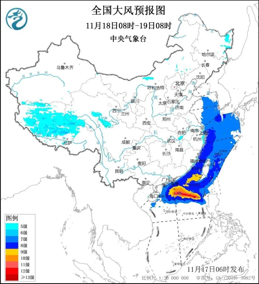 11月18日8时至19日8时,西藏北部和西部、青海南部、黑龙江东部、浙江东部、福建东部、广东东部、台湾岛等地有5至6级、阵风7至8级的大风。黄海中部和南部海域、东海大部海域、台湾海峡、台湾以东洋面、巴士海峡、南海北部和中部海域将有7至8级、阵风9级的大风,其中台湾海峡和南海北部部分海域风力可达9级、阵风10至11级,台风“万宜”中心经过的附近海域风力可达10至12级、阵风13至14级。